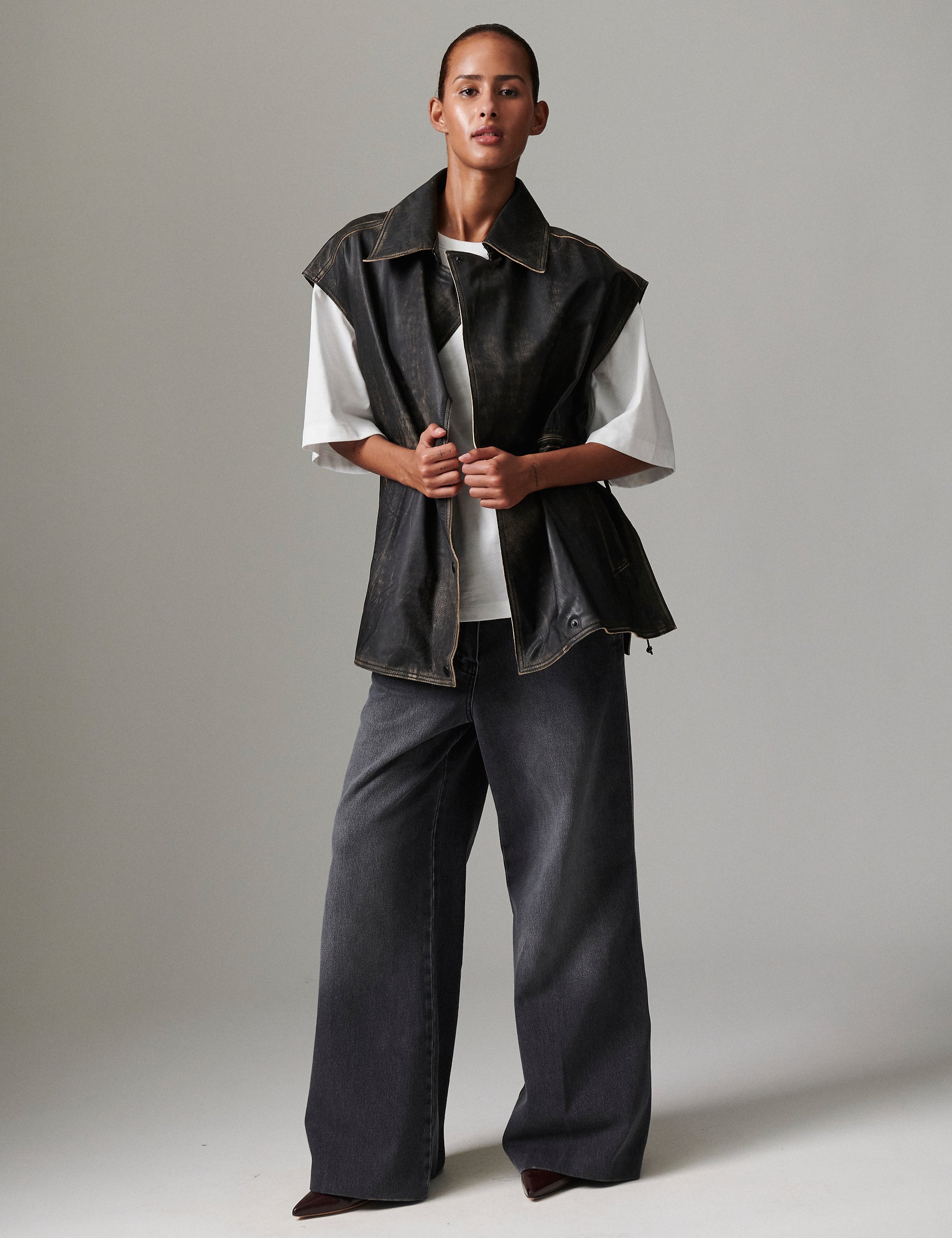 This sleeveless leather waistcoat features drawstrings at the sides, snap button closures, side pockets, and long slits at the sides. The waistcoat is unlined and has an oversized fit.